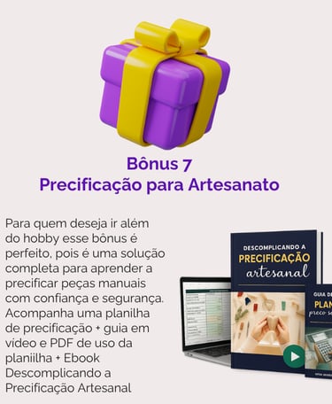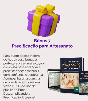 Bônus 7: Precificação para artesanato: Kit completo contendo planilha, guia em vídeo e em PDF e o Ebook Descomplicando a Precificação Artesanal.
